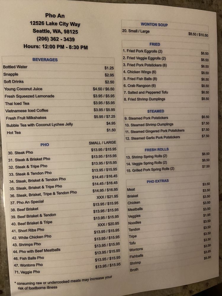 Welcome to Pho An, a delightful Vietnamese gem nestled in Seattle at 12526 Lake City Way NE. Known for its vibrant flavors and inviting atmosphere, Pho An offers a menu that tantalizes the taste buds with an array of steamed rice dishes and pho options that are sure to impress.